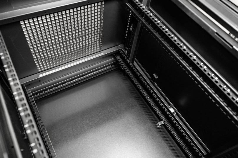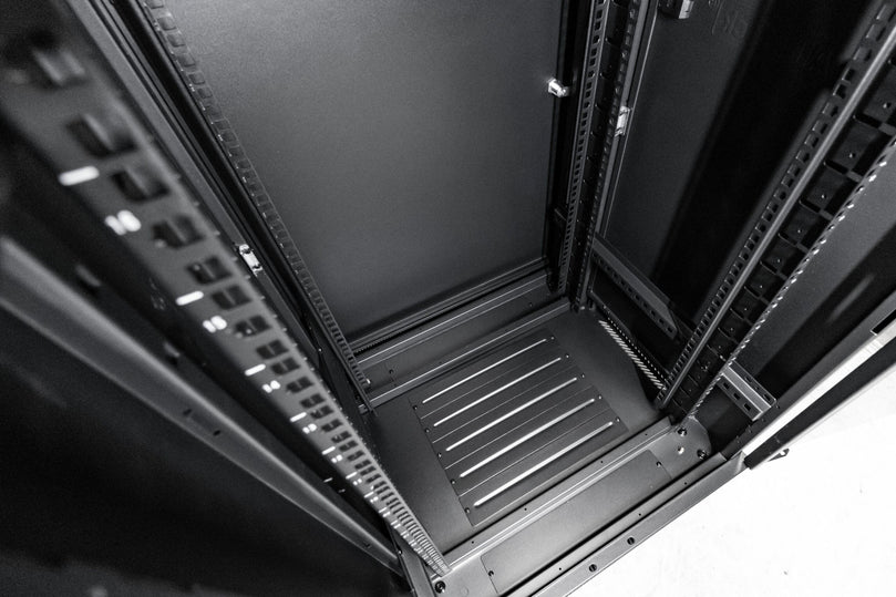 The fully adjustable 19” mounting profiles are printed numerically with the “U” height, for ease of installation and future use. Cable entry is from directly underneath or on the roof in the form of removable blank panels.