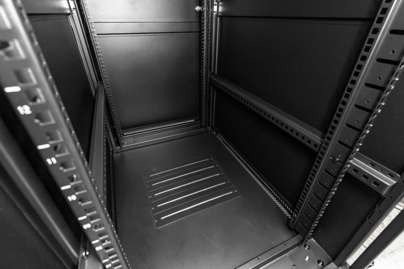 The fully adjustable 19” mounting profiles are printed numerically with the “U” height, for ease of installation and future use. Cable entry is from directly underneath or on the roof in the form of removable blank panels.